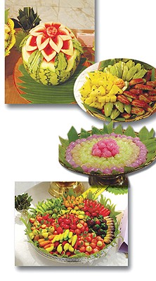 foods and delightfully carved fruit. |