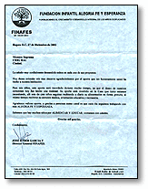 D.C. December 27, 2002 Supreme Master Ching Hai: I extend to You my warmest greetings, wishing You success in all of Your projects. I also wish to thank You sincerely for the contribution You have charitably given to our institution. This contribution will be remembered by my children for a very long time because today our heartfelt desire came true. Your contribution will be invested in the residence that we need so much. There, each day more than a hundred children will continue to receive free meals, along with medical care, educational assistance and recreation. Again, I thank You for Your valuable contribution, because of people like You, we can continue working with happiness, faith and hope. Thank You very much. Sincerely Yours,