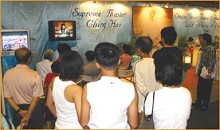Although the Fair is an annual event in Singapore, this year it held a special meaning for local initiates as it was their first Truth-sharing activity after Master announced 2004 as Golden Year One. Master’s exhibition booth was so gracious and radiant that it stood out prominently from the rest of the displays. The booth’s designer (an initiate) used an open concept motif, meaning there were no partitions or enclosures, and in the middle was the focal point — a life-sized photo of Master in meditation sitting on a golden lotus. In front of the image a small stone water fountain flowed continuously, surrounded by several Longevity Lamps. On the right was a display of Master’s paintings and next to it was a plasma TV that constantly displayed a great variety of Master’s images. Attracted by Her ever-changing form, many visitors came in to enquire about Her teachings. On the left was the video viewing area where Master’s video lectures were shown continuously. Among the presentation, the one featuring Master’s 1995 lecture in Singapore attracted the greatest number of viewers.