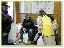 drinks and warm clothing to the homeless who gathered on the sidewalk