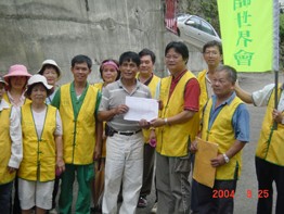 Then, on the afternoon of September 25, sixteen sisters and brothers met in Jhudong to drive eight truckloads of supplies to Wufeng. The provisions included 200 sleeping bags, 204 bottles of vegetable oil, 100 packets of washing powder, 216 packets of edible salt and nine boxes of new and used clothing. The Association members were received by Mr. Lin Xiang-xing, chairman of the Wufeng Township Representatives' Council. Then, together with several local residents, they unloaded the supplies at Chairman Lin's house for later transfer to typhoon victims at three different shelters.