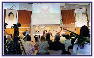 The Association’s booth was located in the Fair’s Religion and Spirituality section, among German and international exhibitors of various religious denominations, including Muslims, Hindus, Sufis, Buddhists and several Christian and non-denominational spiritual groups. The atmosphere in the section was calm and relaxed, and the initiates openly exchanged information and sweets with their visitors and with exhibitors from neighboring booths. The focal point of the Association’s beautifully decorated display was a large video screen, on which Master’s video lectures were shown continuously. Many Fair visitors felt attracted to the beautiful foreign lady giving the lectures, often pausing to watch, inquire about Her teachings and obtain Her publications and information packets on the Quan Yin Method.