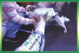 pets and carrying slogan posters on their backs while distributing leaflets