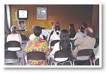 Khán giả say mê chăm chú xem băng thuyết pháp của Sư Phụ.
