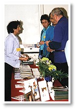 bàn luận giáo lý Sư Phụ với một đồng tu đang trưng bày sách báo.