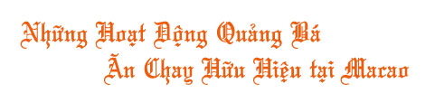 [Ma-Cao] [Macao] Từ khi đồng tu Macao tham gia vào Hội Chợ Triển Lãm Sách Ngang Eo Biển vào tháng ba, 2002, nhiều người trong vùng đã bắt đầu ưa thích giáo lý Sư Phụ. Nhưng sự hiểu biết thiếu sót về vấn đề ăn chay đã khiến một số người trì hoãn việc tu pháp Quán Âm. Ðể giúp giải quyết tình trạng này, các đồng tu quyết định giới thiệu phép ăn chay đến công chúng bằng cách mở những lớp dạy nấu thức ăn chay, chuẩn bị hàng tuần một bữa ăn tự phục vụ với nhiều món ăn theo khẩu vị địa phương như Thượng Hải, Quảng Ðông, Hubei, Âu Lạc, và Macao.