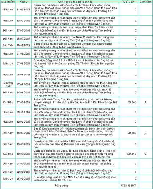 Bảng 2: Chi tiết về chi phí cho những hoạt động từ thiện ở Formosa