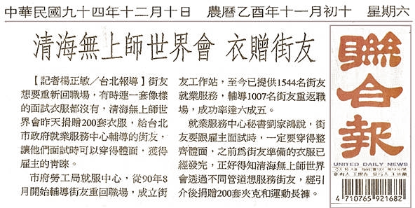 Ông Liu Jia-hong, Thư Ký Trung tâm Phục vụ Tìm Việc Làm, cho hay: "Những người bạn ngoài đường của chúng ta phải ăn mặc chỉnh tề mới đi phỏng vấn tìm việc được, nhưng y phục mà chúng tôi chuẩn bị trước kia đã phát hết rồi". Các hội viên Hội Quốc tế Thanh Hải Vô Thượng Sư cố gắng giúp những người đường phố, và khi được biết tình trạng, họ đã tặng 200 bộ áo khoác và quần.
