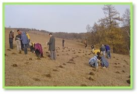 Ðể mừng ngày sinh nhật của Sư Phụ vào tháng 5, Kim niên 3 (2006), Trung tâm Ulaanbaatar đã lãnh nhận một mảnh đất 5 mẫu ở Zuunsalaa và trồng 3500 cây nhằm đáp lại lời kêu gọi của chính phủ (xin xem Bản Tin 169 để biết thêm chi tiết). Khi Sư Phụ biết được tin này, Ngài liền chỉ thị đóng góp tổng cộng 20.000$ Mỹ kim để hỗ trợ cho chính phủ thực hiện chính sách tốt đẹp này. Khi chúng tôi đem đề án trồng cây trình cho Bộ Thiên nhiên và Môi trường, nhân viên của họ hết lòng khen ngợi hành động từ thiện của Sư Phụ, bày tỏ lòng cảm kích của họ với nỗ lực bảo vệ môi trường và công tác từ thiện của chúng tôi, trong khi nhiều người đang chặt cây và đốn rừng. Vào ngày 19 tháng 10, đồng tu bắt đầu trồng 30 ngàn cây, chú trọng vào vùng đất 5 mẫu đã lãnh nhận cũng như những vùng lân cận, với hy vọng hoàn thành công trình trước khi tuyết rơi. Vào lúc đó, nhiệt độ khoảng không độ và bông tuyết nhỏ đã xuất hiện. Với sự giúp đỡ của một vài công nhân chúng tôi mướn và sự hợp tác của hơn hai mươi đồng tu, tất cả số cây đã được trồng vào ngày 22 tháng 10. Cơn tuyết theo sau trận mưa ngày 21 tháng 10 bao phủ Zuunsalaa và những thành phố lân cận. Ngày hôm sau, tất cả tuyết trên mặt đất đều tan rã và vì thế cung cấp lượng nước cần thiết cho những cây vừa trồng. Trong những ngày này, chúng tôi cảm nhận tình thương của Thượng Ðế đồng hành với chúng tôi và chăm sóc mọi việc từng chi tiết. Khi các phóng viên từ đài truyền hình nghe tin, họ đã đến để phỏng vấn chúng tôi tại hiện trường. Dưới sự trưởng dưỡng của tình thương Thượng Ðế, các cây non được trồng trong tháng 5 đã lớn cao được 30 phân và trông khỏe mạnh và dễ thương. Chúng tôi hình dung rằng những cây non này sẽ từ từ lớn cao lớn mạnh và sẽ canh giữ cánh rừng xinh đẹp, giúp giảm nhẹ tình trạng hâm nóng toàn cầu và cho thế hệ sau một thế giới tươi đẹp để sinh sống. Cho mùa xuân kế, đồng tu kế hoạch sẽ tiếp tục dự án trồng cây trong những vùng cần thiết khác.
