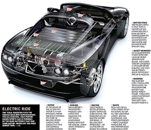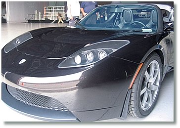 Xe Roadster sang trọng trẻ trung của hãng máy Tesla là một chiếc xe không mui, chạy bằng điện dùng kỹ thuật tăng nạp, với hình dáng, cảm giác và chạy y như hầu hết các xe thể thao thượng thặng khác nhưng không gây ra tiếng động. Dùng bộ số đặc biệt 2-vận tốc và máy nạp điện 3-pha, 4-cực, xe Roadster có thể vọt từ 0 đến 60 dặm giờ trong vòng 4 giây với tốc độ cao nhất là 130 dặm giờ. Xe có thể chạy 250 dặm (420 cây số) với mỗi một lần nạp điện. Phạm vi sử dụng được nới rộng nhờ phương thức tân trang pin lithium-ion với Hệ thống Tích lũy Năng lượng cần khoảng chừng 3 tiếng rưỡi để nạp điện hoàn toàn. Mặt trước với bề ngoài bóng loáng mượt mà của kiểu xe không mui Tesla. Tesla sẽ chuyển giao những chiếc xe đầu tiên vào cuối năm 2007 từ Anh Quốc. 100 chiếc sản xuất loạt đầu đã được đặt cọc mua trước bởi khách hàng như tài tử George Clooney và nhà đầu tư xe Tesla, ông Sergery Brin. Những chuyên viên thiết kế và kỹ sư của Tesla cũng đã đi rất xa trong việc bảo đảm rằng xe chạy an toàn. Mục tiêu của họ là vượt trên các tiêu chuẩn khắt khe của Tiêu chuẩn An toàn Xe hơi Liên bang, hay FMVSS, đề ra bởi Bộ Giao thông An toàn Xa lộ Quốc gia (NHTSA). Họ cũng đang tiến hành việc cung cấp cho người tiêu dùng một hệ thống dùng kiếng năng lượng mặt trời. ![]() Mặt sau của xe không mui Tesla với giàn máy và các cơ cấu liên hệ.