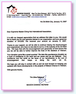 Trung tâm này không phải là một nơi tạm trú cũng không là một bệnh viện, mà là một căn nhà giản dị được trang bị để cung cấp phần quan trọng nhất là y tế cũng như giáo dục và huấn luyện cho người tàn tật. Mục tiêu dài hạn của Maison Chance là giúp những người thụ hưởng có được những kỹ năng chuyên nghiệp để họ trở nên tự lập về tài chính và tái hòa nhập vào xã hội. Sau nhiều năm phát triển, Maison Chance đã trở thành một tổ chức quốc tế với chi nhánh ở Âu Lạc, Pháp, Thụy Sĩ, Hoa Kỳ và Bỉ. Sau khi biết về sự cống hiến vô ngã của cô Tim, Thanh Hải Vô Thượng Sư đã gửi tặng 10.000$ Mỹ kim cho hội từ thiện này. Trong một lá thư cảm tạ, cô Rebeaud bày tỏ lòng tri ân đối với Thanh Hải Vô Thượng Sư như sau: "Với niềm cảm kích tận đáy lòng, chúng tôi xin dâng lá thư này lên Ngài. Chúng tôi xin cảm ơn sự ưu ái của Ngài đối với tổ chức của chúng tôi và sự đóng góp quảng đại 10.000$ Mỹ kim của Ngài. Món quà này đến như một sự ngạc nhiên lớn! Chúng tôi xem món quà tự nguyện này là một biểu hiện của sự tin tưởng vào công việc và mục đích của tổ chức, và chúng tôi rất hân hạnh".