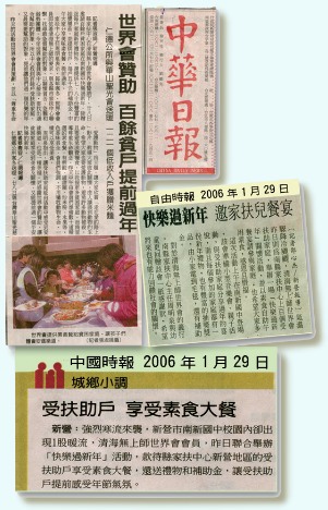 Vì tiết đông đã tới và Tết sắp đến, Trung tâm Ðài Nam tổ chức một sinh hoạt "Tân niên vui vẻ" cho khoảng 100 gia đình nghèo với phụ huynh đơn thân đang nhận trợ cấp của Chương trình Giúp đỡ Gia đình tỉnh Ðài Nam. Các đồng tu địa phương đã chuẩn bị một buổi hòa nhạc nhỏ xuất sắc, trò chơi cho phụ huynh và trẻ em, và một bữa tiệc chay thịnh soạn. Mỗi gia đình nhận được một gói quà Tết trong cuộc xổ số may mắn với hàng trăm giải từ dụng cụ điện dùng trong nhà cho đến chăn bông phủ giường. Hai chục gia đình đang cần sự giúp đỡ khẩn cấp nhận được hiện kim 5.000$ NT (khoảng 150 $ Mỹ kim) mỗi hộ, để có thể ăn Tết. Nhiều phóng viên đã đến tường thuật sinh hoạt này, được tổ chức vào ngày 28 tháng Giêng, Kim niên 4 (2007), trong hội trường chánh của trường Trung học đệ nhất cấp Nanxin tỉnh Ðài Nam. Trong số quan khách có một bà mẹ độc thân với ba đứa con. Cả gia đình đều ăn chay. Bà nói với chúng tôi rằng bà cảm nhận được một lực lượng rất mãnh liệt khi đến chỗ họp. Lúc nhìn thấy chân dung của Sư Phụ, bà cảm thấy rất quen thuộc vì Sư Phụ đã đến thăm bà trong giấc mơ đêm trước, trang phục giống y như trong hình. Người mẹ này vô cùng xúc động. Ông Zhou Ming-quan, giám đốc của Chương trình Giúp đỡ Gia đình, cùng với hai mươi trẻ em từ những gia đình được hưởng lợi ích đã gửi một lá thư cảm tạ tới Hội Quốc tế Thanh Hải Vô Thượng Sư. Giám Ðốc Zhou không ngừng bày tỏ lòng biết ơn của ông đối với ân điển và sự từ thiện của Ngài, và chúc Ngài một Năm Mới rất vui vẻ. Nghi Lan