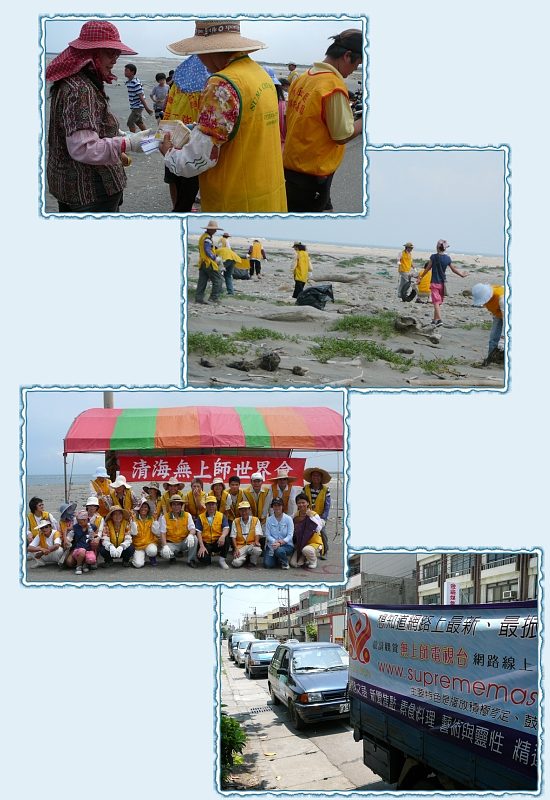 [Chương Hóa]Vào ngày 26 tháng 5, Kim niên 4 (2007), đồng tu Chương Hóa đã tham gia vào hoạt động làm sạch bãi biển vào mùa xuân do chính quyền thôn Tuyến Tây tổ chức. Vào cuối ngày, đồng tu biếu tặng nhiều phẩm vật về Truyền hình Vô Thượng Sư và Lối Sống Mới cho tất cả các thiện nguyện viên tham gia để làm kỷ niệm. Ðồng tu sau đó nối đuôi đoàn xe hộ tống diễn hành trưng bày hai thông điệp này để thêm nhiều người biết về trường chay và Truyền hình Vô Thượng Sư. ![]() Truyền bá thông điệp tốt