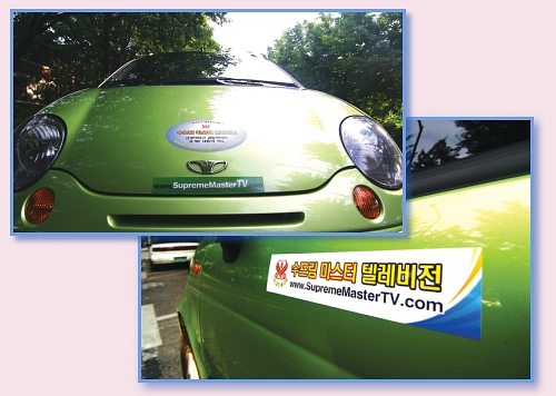 TÐồng tu Hàn Quốc đã dán nhãn Truyền hình Vô Thượng Sư trên xe họ để quảng bá đài.