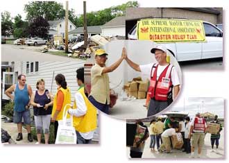 và đi đến những vùng bị ảnh hưởng để cung cấp tiếp liệu cũng như chia sẻ tình thương của Sư Phụ với các nạn nhân hầu giúp khôi phục lại hy vọng cho họ.