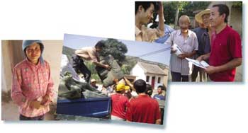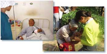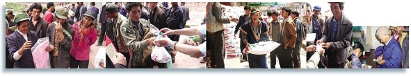 Tình hình của huyện Ðơn Phụng thuộc thành phố Thương Lạc đặc biệt trầm trọng, vì thế các đồng tu đi sâu vào vùng bị ảnh hưởng để cứu trợ hai lần vào tháng 7 và tháng 8. Gần cuối tháng 7, ngoài việc giao một phần phẩm vật cứu trợ cho Văn phòng Cứu trợ Thiên tai của huyện Ðơn Phụng, chúng tôi cũng mang đến nhiều giường xếp, chăn bông, gạo, mì khô, muối và nhiều món cần thiết khẩn cấp khác cho các nạn nhân trong những vùng bị tàn phá nhiều nhất. Ðể có thể thi hành công việc một cách nhanh chóng, chúng tôi vác phẩm vật trên vai và đi bộ 30 cây số, nhờ đó vượt qua được những trở ngại gây nên bởi đường xá bị hư hại. Chúng tôi cũng phát tiền cứu trợ cho những nạn nhân khốn khổ nhất. Khâm phục phương pháp phi thường chúng tôi đối phó với tình trạng cứu trợ này, tờ báo Hoa Thương và trang mạng thông tin chính phủ huyện Ðơn Phụng đã tường trình về nỗ lực cứu trợ của chúng tôi kỳ này. Ðến gần cuối tháng 8, chúng tôi một lần nữa đi thăm các nạn nhân ở huyện Ðơn Phụng mang theo nhiều phẩm vật cứu trợ như gạo, dầu ăn, chăn bông và quần áo. Huyện trưởng vô cùng cảm động nói: "Chúng tôi thật sự rất biết ơn! Những hành động từ thiện của quý vị cung cấp tôi một bài học đáng kính rất tốt cho chúng tôi. Chúng tôi chắc chắn sẽ noi gương quý vị và học hỏi tinh thần hy sinh của quý vị để tăng cường nỗ lực cứu trợ của chúng tôi!" Ở huyện Phật Bình của thành phố Hán Trung, bắt đầu vào tháng 7, đã có bốn trận mưa bão khổng lồ gây nên nhiều thiên tai trầm trọng bao gồm lũ lụt, đất lở và bùn lở. Nhiều người chịu cảnh mất mát to lớn hoặc thậm chí mất hết tất cả. Vào đầu tháng 9, chúng tôi mang đến cho họ một ít gạo, bột mì, dầu ăn và những món cứu trợ khác. Hiện giờ là giữa mùa thu và tiết trời đang trở lạnh hơn, chúng tôi mang 430 bộ mền dầy và yêu cầu Bộ Hành chánh Dân sự phát cho các nạn nhân. Ở huyện Thương Nam, khi chúng tôi đang mua 400 chiếc chăn bông, vị chủ tiệm vô cùng cảm động bởi hành động từ thiện của chúng tôi. Ông cúng dường một số tiền, nhờ chúng tôi chuyển đạt lòng quan tâm của ông đến các nạn nhân, và cũng quyết định ăn chay 3 ngày. Từ sự kiện này, chúng tôi ý thức được rằng những việc làm từ bi của chúng ta có thể làm tấm gương cho người khác và ảnh hưởng đến họ, nhờ đó mang lại những thay đổi tích cực cho xã hội. Tỉnh Cam Túc