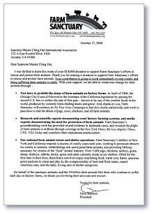 Biết đến công việc cao quí của Farm Sanctuary, Vô Thượng Sư Thanh Hải đã quảng đại đóng góp 10.000$ mỹ kim để ủng hộ cho nỗ lực từ bi cứu giúp động vật của họ. Chi phiếu đã được trao cho ông Gene Bauston, chủ tịch kiêm sáng lập viên của Farm Sanctuary, vào ngày 18 tháng 10, Kim niên 3 (2006). Ông Bauston, một người thuần chay, đã dành nhiều thời gian kêu gọi mọi người và khuyến khích họ xem loài vật như một sinh vật có cảm xúc, chứ không phải là những miếng thịt. Trong một buổi phỏng phấn của Truyền hình Vô Thượng Sư, ông đã biểu lộ lòng cảm kích sâu sắc đối với sự ủng hộ và đóng góp của Sư Phụ, và việc làm của Ngài là tạo dựng một thế giới tốt đẹp hơn.